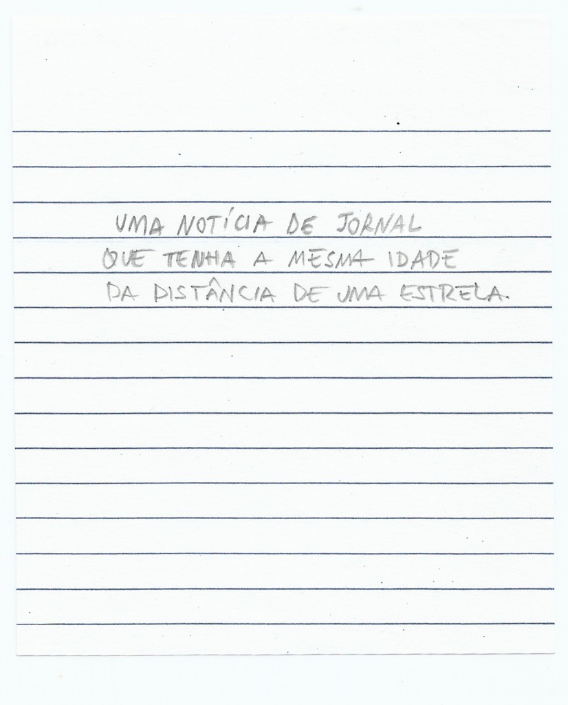 A limitação desse encontro existe na data da invenção do jornal, que podemos supor não passar de 600 anos desde sua primeira publicação em papel, e mesmo indo mais longe se considerarmos os primórdios. Mas estrelas, essas proliferam mais que notícias de jornal, existem desde quando não sabíamos contá-las. Existem antes de existir a palavra existir. Existem na distância de bilhões de anos-luz. Acontecimentos existem antes mesmo de existir jornal e não dependem dele, só se virarem notícia. Uma estrela conta sobre o universo, uma notícia de jornal conta sobre o universo de um dia. Uma estrela morre e ainda a veremos por muitos anos, as notícias acontecem depois do fatos. Quem morre na notícia é vítima, se uma estrela explode, aparece no jornal. Uma notícia no jornal morre rápido se quem morre não é importante. Se é, fica guardada por anos. As estrelas, fotografamos; as notícias, imprimimos. Contamos estrelas com os dedos, a notícia contamos para os vizinhos. Contamos as notícias quando são importantes, quando são insignificantes esquecemos. Há estrelas que não vemos que são maiores que outras que vemos; de uma estrela só, quase nunca sabemos o nome, pois não vemos o seu rosto; mas quando as vemos próximas umas da outras, formam constelações. Essas ganham nome e desenho, e doze delas entram na sessão horóscopo do jornal, mudando a sorte de alguém. Também damos nome para um Oceano, mas não damos para uma poça d’água. Mar, antes de ser Oceano, era grande água desconhecida. Estrela ainda é lume que vaga, mas já estão catalogadas, as mais próximas. O jornal diário é uma constelação de acontecimentos. A luz da estrela mais próxima leva oito minutos para chegar na terra, é o sol. Quando explodir, não vai estar no jornal. Um acontecimento só aparece no jornal no dia seguinte. Sonhou que caía num abismo, um senhor desempregado que dormia na praça quando a enchente o carregou. Sua foto permanece estampada no Jornal A Nota, do Rio de Janeiro, de 1935, que encontramos em antiquários por 5 reais. Se uma estrela com essa idade estivesse à venda, não seria tão fácil comprar. Em 1935, um homem sonhava que caía no abismo, e nesse mesmo ano partia a luz de Ankaa. A notícia e a estrela: 77 anos as separam do agora. Mas notícias envelhecem mais rápido que estrelas: em 2013, cada qual segue seu rumo.