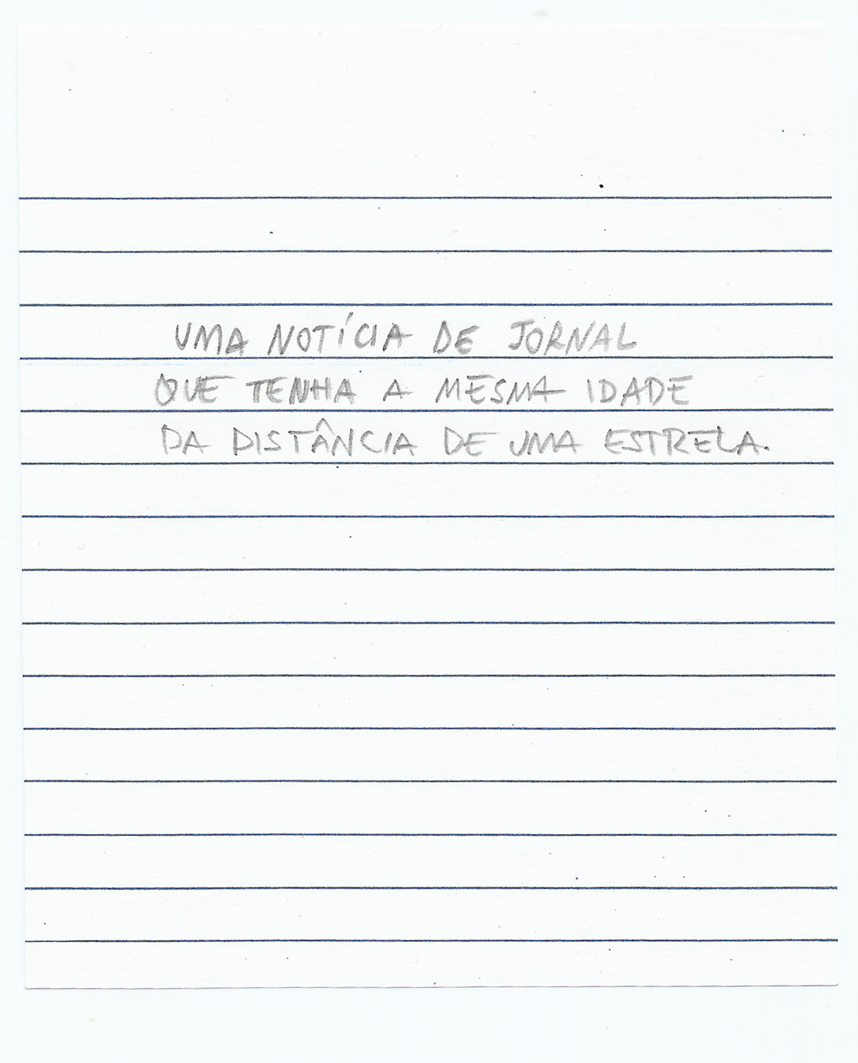 A limitação desse encontro existe na data da invenção do jornal, que podemos supor não passar de 600 anos desde sua primeira publicação em papel, e mesmo indo mais longe se considerarmos os primórdios. Mas estrelas, essas proliferam mais que notícias de jornal, existem desde quando não sabíamos contá-las. Existem antes de existir a palavra existir. Existem na distância de bilhões de anos-luz. Acontecimentos existem antes mesmo de existir jornal e não dependem dele, só se virarem notícia. Uma estrela conta sobre o universo, uma notícia de jornal conta sobre o universo de um dia. Uma estrela morre e ainda a veremos por muitos anos, as notícias acontecem depois do fatos. Quem morre na notícia é vítima, se uma estrela explode, aparece no jornal. Uma notícia no jornal morre rápido se quem morre não é importante. Se é, fica guardada por anos. As estrelas, fotografamos; as notícias, imprimimos. Contamos estrelas com os dedos, a notícia contamos para os vizinhos. Contamos as notícias quando são importantes, quando são insignificantes esquecemos. Há estrelas que não vemos que são maiores que outras que vemos; de uma estrela só, quase nunca sabemos o nome, pois não vemos o seu rosto; mas quando as vemos próximas umas da outras, formam constelações. Essas ganham nome e desenho, e doze delas entram na sessão horóscopo do jornal, mudando a sorte de alguém. Também damos nome para um Oceano, mas não damos para uma poça d’água. Mar, antes de ser Oceano, era grande água desconhecida. Estrela ainda é lume que vaga, mas já estão catalogadas, as mais próximas. O jornal diário é uma constelação de acontecimentos. A luz da estrela mais próxima leva oito minutos para chegar na terra, é o sol. Quando explodir, não vai estar no jornal. Um acontecimento só aparece no jornal no dia seguinte. Sonhou que caía num abismo, um senhor desempregado que dormia na praça quando a enchente o carregou. Sua foto permanece estampada no Jornal A Nota, do Rio de Janeiro, de 1935, que encontramos em antiquários por 5 reais. Se uma estrela com essa idade estivesse à venda, não seria tão fácil comprar. Em 1935, um homem sonhava que caía no abismo, e nesse mesmo ano partia a luz de Ankaa. A notícia e a estrela: 77 anos as separam do agora. Mas notícias envelhecem mais rápido que estrelas: em 2013, cada qual segue seu rumo.